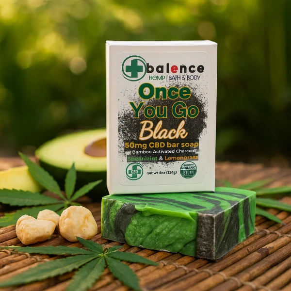 Bold, Fresh, Distinct. Once You Go Black is a striking handcrafted bar with swirls of bamboo charcoal and a refreshing blend of spearmint and lemongrass. Made with shea butter, coconut oil, avocado oil, and hemp seed oil, plus a touch of hemp CBD isolate, it lathers richly and rinses clean. A fresh and bold choice for daily washing.